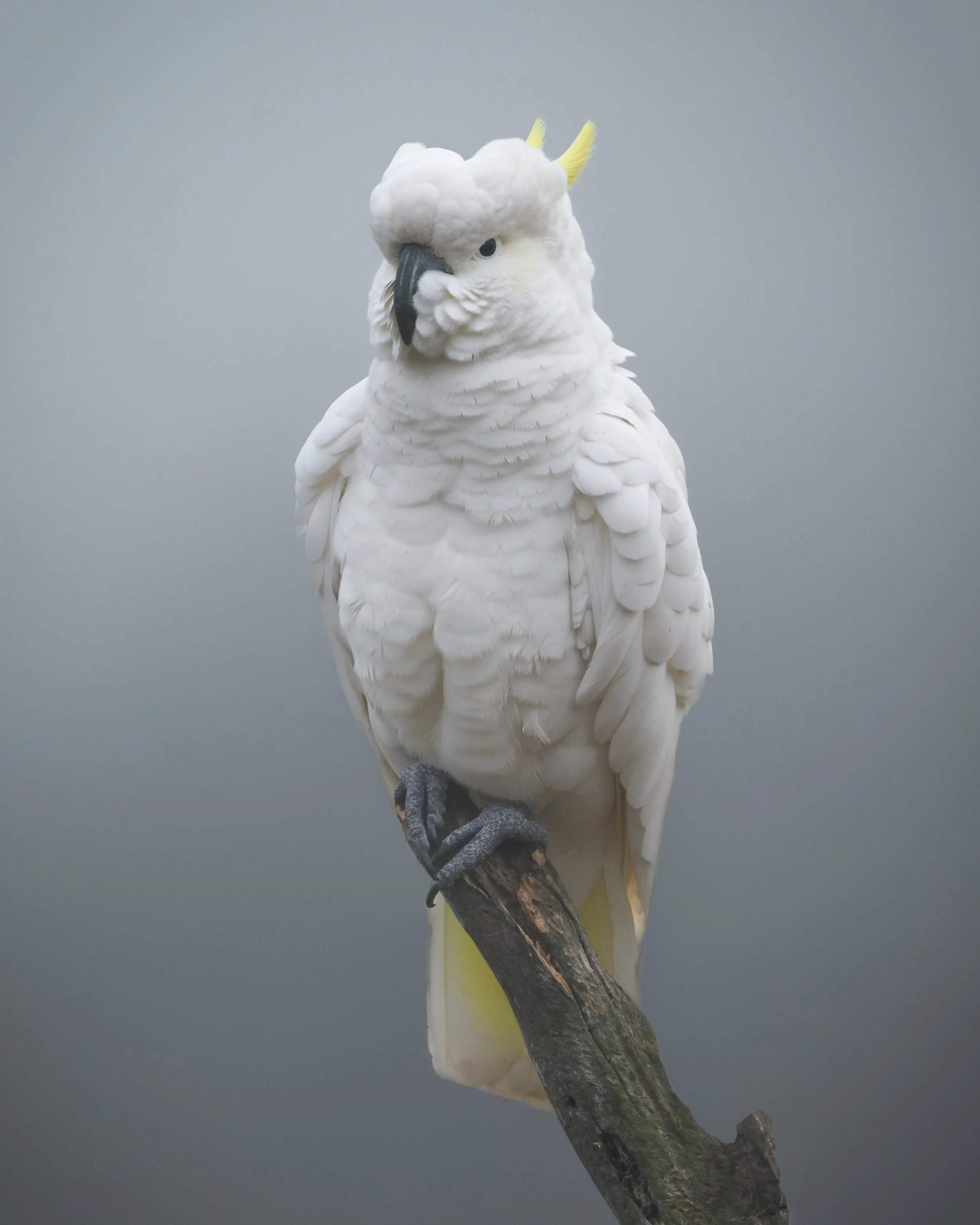 A sulphur-crested cockatoo, perched on a branch against a gloomy, moody background.