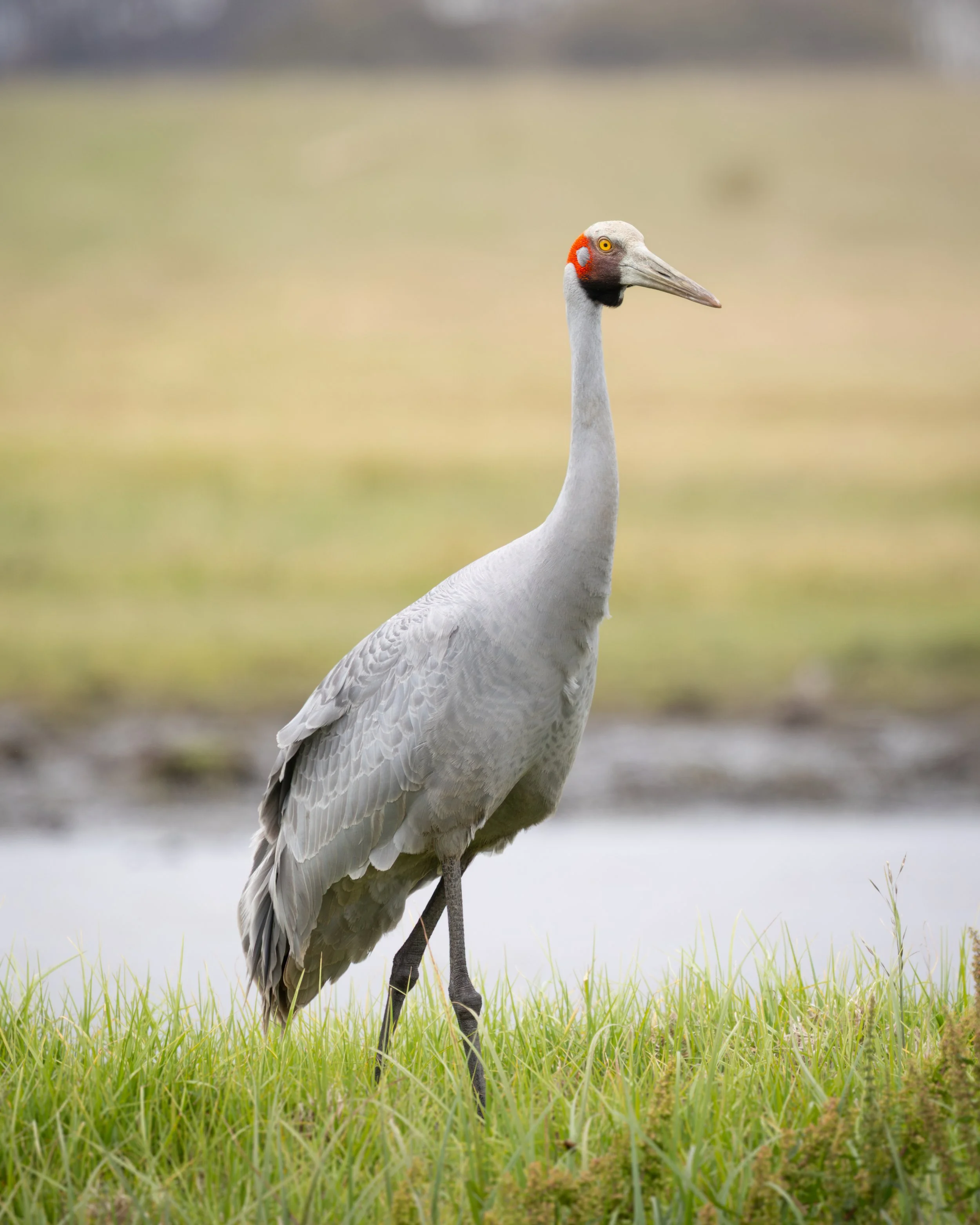 A brolga standing in green grass near a body of water with a blurred natural background. Shot at Werribee Treatment Plant.