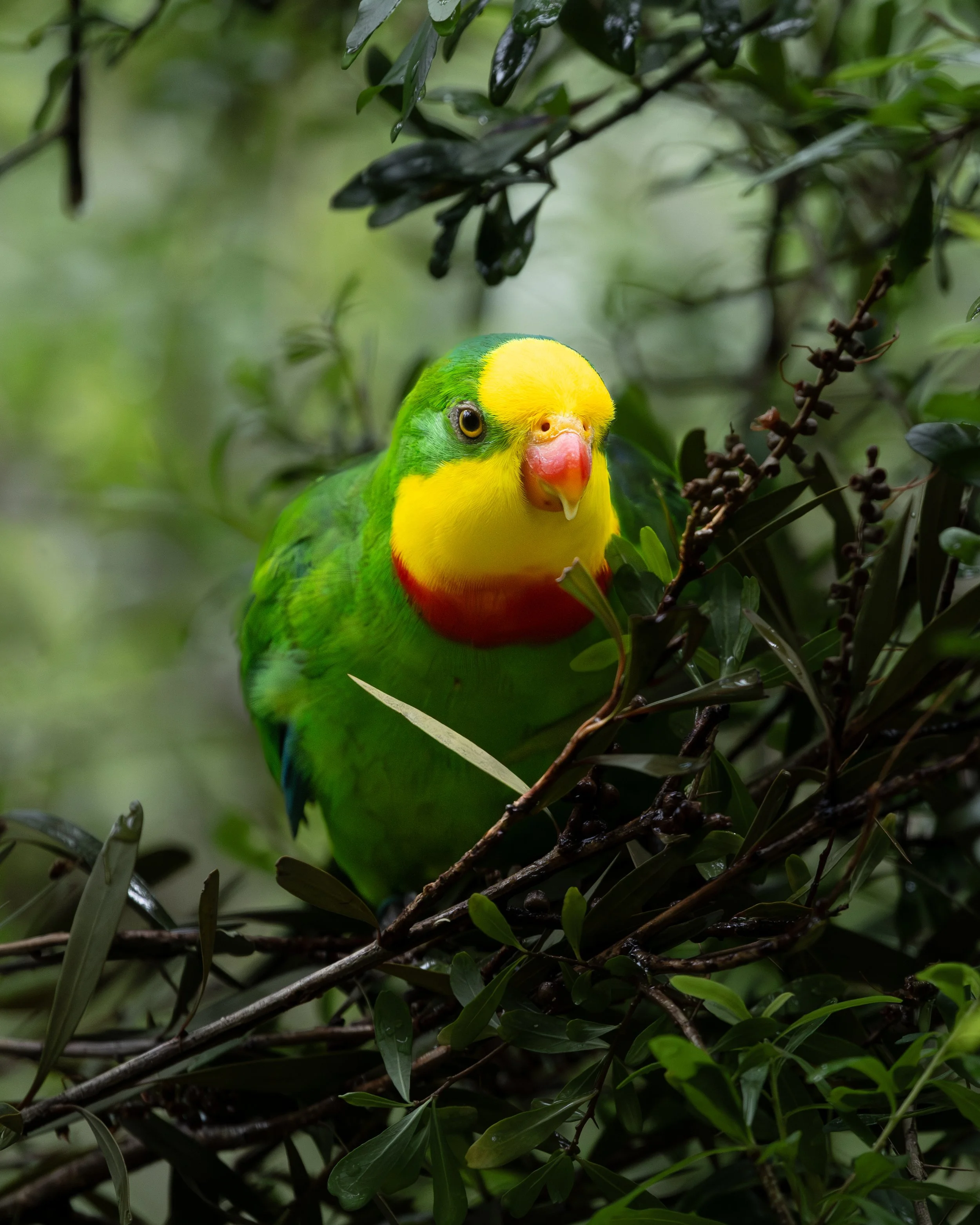 Colorful parrot with yellow face, red throat, and green body perched on a branch among dark green leaves.
